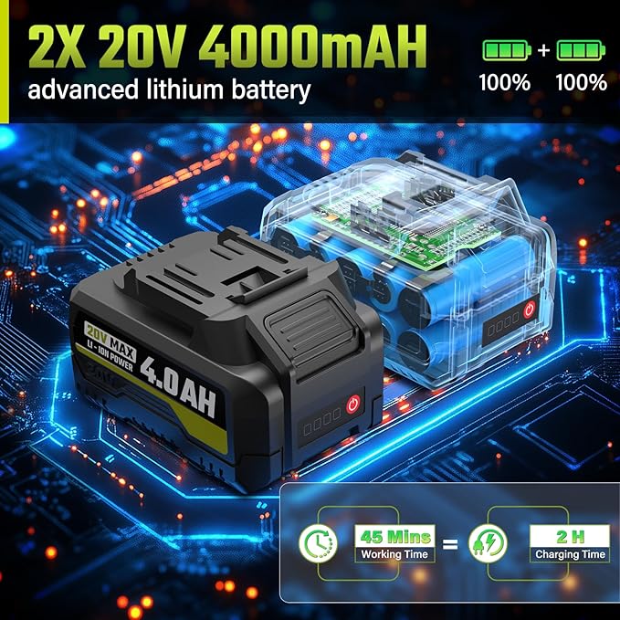 - 2 X 4.0Ah LARGE-CAPACITY BATTERIES: 2*4000 mAh batteries and 1.8A fast dual port charger with exceptional performance and cutting performance comparable to gas powered chainsaws; Up to 100 cuts of 4x4 inch wood on a per charge and up to 45 min of run time, greatly extending work time