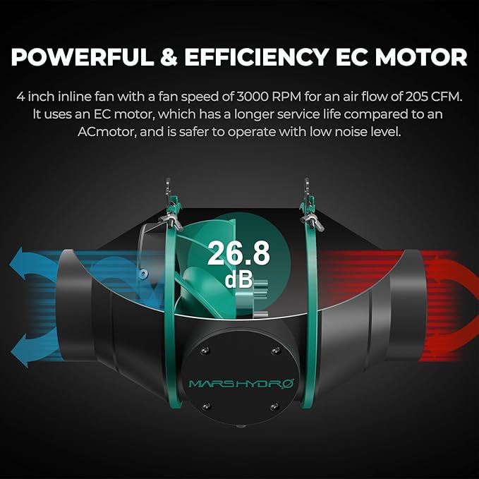 - 【205CFM ADJUSTABLE&EFFICIENT VENTILATION SYSTEM】The Inline fan blades have a mixed flow design to provide active air to your growing space, the fan runs at 2600 RPM,adjustable speed from 0 to 100%,and provides 205CFM of airflow. Only 26.8 dB noise. 1050+ RC 48 Australian Virgin Charcoal with 25ft length flex ducting,effectively filters impurities and odors from the air.