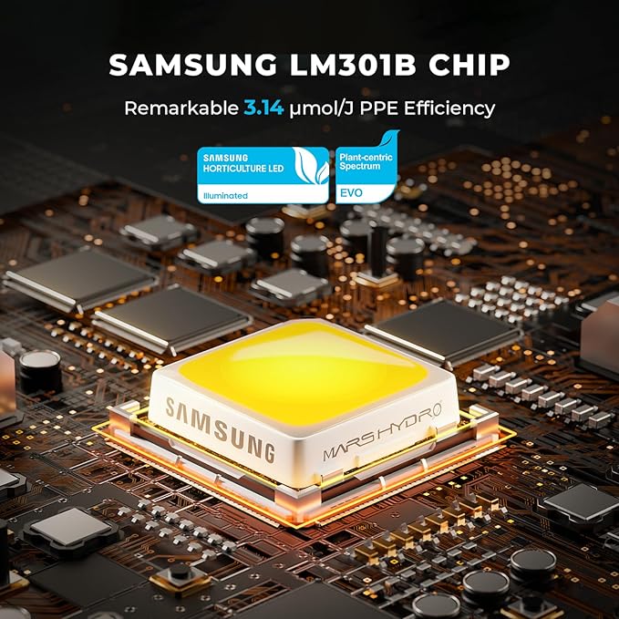 - 【150W HIGH YIELD SMART DIMMABLE GROW LIGHT】Packed with cutting-edge Samsung LM301H EVO diodes, delivering a remarkable 3.14 μmol/j per diode and provides an overall PPE of 2.85 μmol/j, a PPFD of up to 420 μmol/m²/s, making it an excellent choice for enhancing flowering to produce higher quality crops and greater yields.Sunlike full spectrum,0 to 100% light brightness adjustment,convenient for energy saving,suitable for all stages of plant growth.