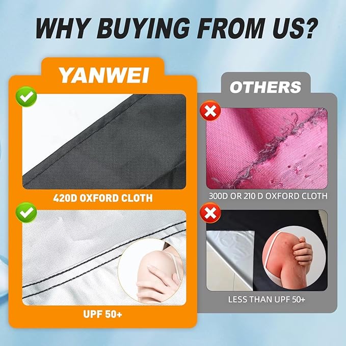 - 【Comprehensive protection】:Made of 420D premium polyester material was more durable than 300D, .Sliver-coated on the back to provide great sun protection, which is waterproof and can effectively reflect 99% harmful sun rays, no need to worry rain or liquid will seep through it. Enhanced double stitching process strengthen the durability and is not easy to tear off.
