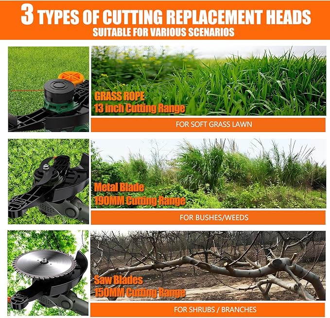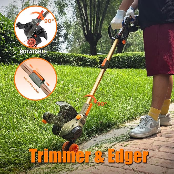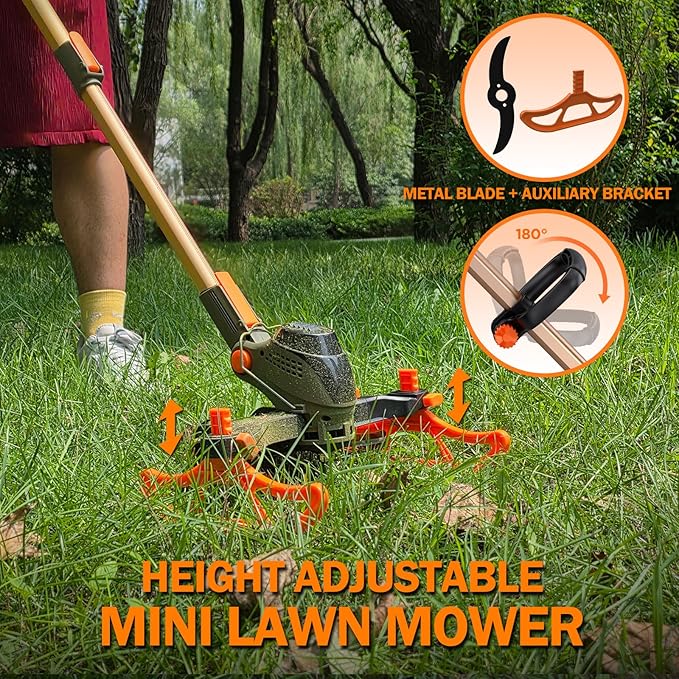 - 🌿【Trimmer/Edger/Lawn Mower/Brush Cutter 4-in-1】: With wheels, Adjustable Bracket,and three cutting types, You can easily switch between Trimmer/Edger/Lawn Mower/Brush Cutter, it can easily clean the lawn.