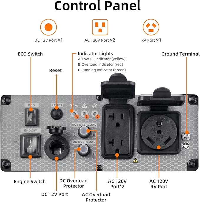 - ๐๐จ๐ฐ ๐๐จ๐ข๐ฌ๐ โ Operating at just 72 dBA away 23FT, this generator provides reliable power for your home during a power outage or RV nights.