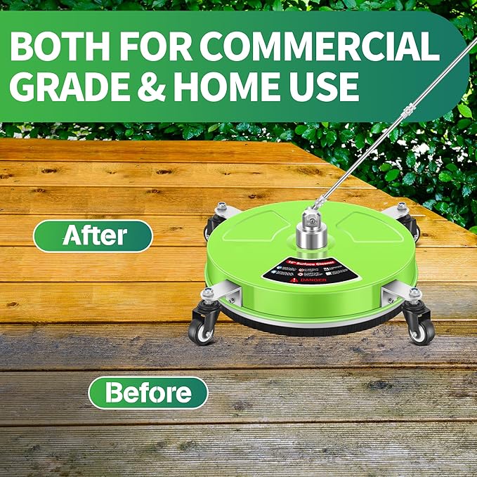 - HIGH-SPEED CLEANING –Our surface cleaner features dual high-pressure jets that spin rapidly to blast through dirt and grime, delivering 5x faster cleaning than standard spray nozzles. Maintains streaks-free results with fixed-height nozzle positioning for uniform coverage. 4 universal wheels enable smooth, effortless movement across surfaces.