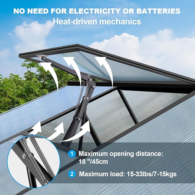 - 【Sturdy Aluminum & Stainless Steel Build】The greenhouse accessories crafted with rust-resistant aluminum and stainless steel for long-lasting performance in humid conditions. The powder-coated aluminum cylinder ensures weatherproof durability. Supports up to 33 lbs (15 kg) and opens windows up to 18 inches (45 cm).
