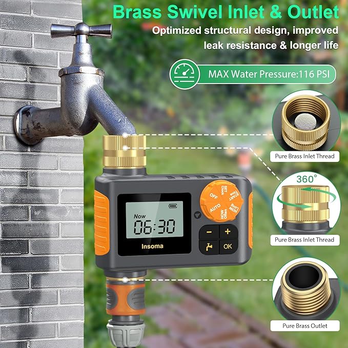 - 【Upgraded Brass Swivel Inlet & Outlet】New upgraded water timer, pure brass water inlet and outlet, brass threads are more leak-proof, strong and durable, enhanced durability, can withstand high working pressure (max 116 psi). Not easy to deform under direct sunlight, will not wear out quickly. Built-in metal filter gasket can effectively prevent sediment and other larger particles from entering the irrigation system