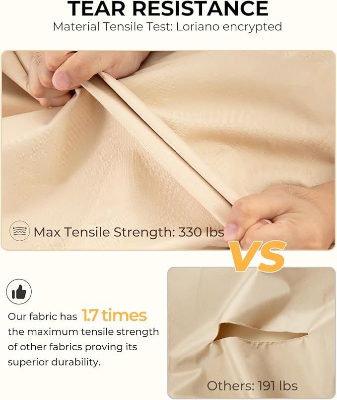 - WATERPROOF: Heavy duty 100% 600D Oxford water-resistant top fabric with added UV-stabilized coating and waterproof undercoating is made to protect your patio furniture cover from natural damage and outdoor elements like sun, dirt, rain, snow.