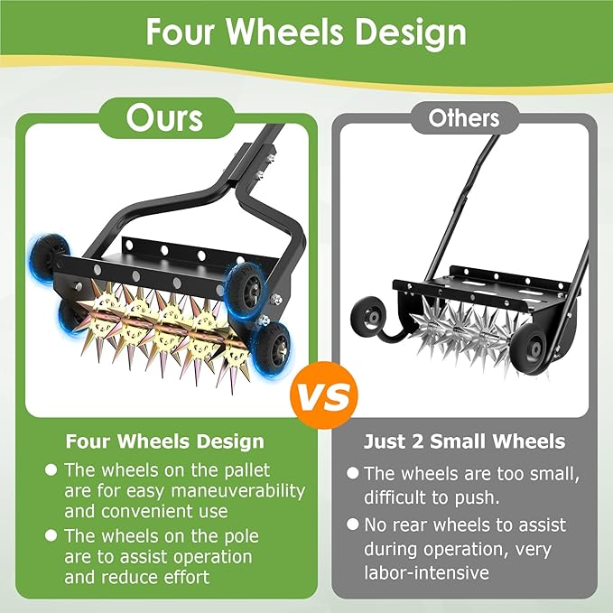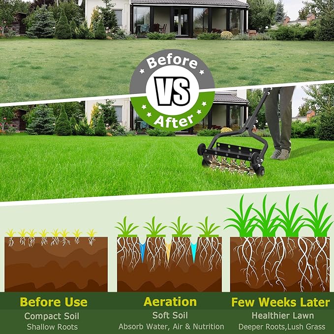 - 【Labor-Saving & Durable】This lawn aerator features an ergonomic T-handle with 3 adjustable heights to reduce back strain. Non-slip grip ensures control, while star-shaped steel tines with side-welded tubes allow easy assembly and strong performance. Anti-rust coated for long-lasting use. Four sturdy rubber wheels offer smooth, stable maneuverability