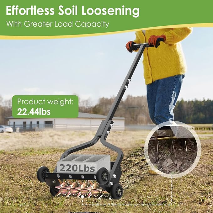 - 【Premium Material】Built with high-quality all-steel construction, this aerator features reinforced side panels and a solid steel axle for superior strength and durability. It resists rust and bending, even on compacted soil. The heavy-duty tray supports up to 220 lbs, allowing you to add cement blocks or weights to boost ground penetration for more effective lawn aeration