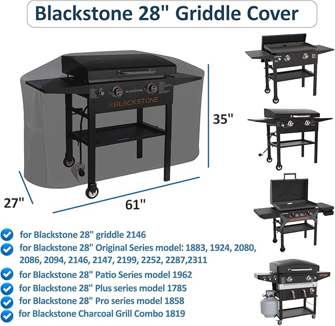 - 28 Inch Blackstone Griddle with Hood Cover: 28 inch griddle cover measures 61"L x 27"Wx 35"H, fits Blackstone original series model 1883, 1924, 2080, 2086, 2094, 2146, 2147, 2199, 2252, 2287,2311 ; patio series model 1962; griddle plus series model 1785; pro series model 1858; 28" griddle with hard cover 2146; blackstone Duo Griddle and Charcoal Grill Combo 1819 and other similar models