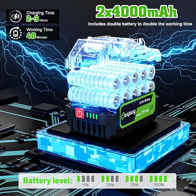 - ๐๐๐ซ๐ ๐ ๐๐๐ฉ๐๐๐ข๐ญ๐ฒ & ๐๐จ๐ง๐ ๐๐ข๐๐ ๐๐๐ญ๐ญ๐๐ซ๐ฒ ๐๐๐๐ค- Ceepuy pole saw is equipped with 2pcs 21V 4000mAh high-energy lithium battery pack that's removable and rechargeable. A quick 2-3-hour charge provides up to 30-40 minutes of continuous use, The battery's overload protection and temperature control system are designed to maximize lifespan. They can be charged and work efficiently at any time, offering convenience and speed.