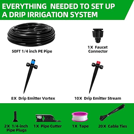 - 【Drip Irrigation System】: The ultimate garden watering solution, upgraded! this set includes 18 droppers, a 50 ft 1/4 inch hose, various connectors, and a complete installation guide. easily meet all watering needs for your garden