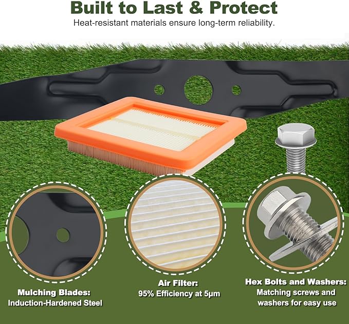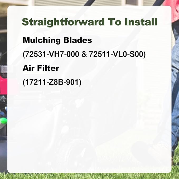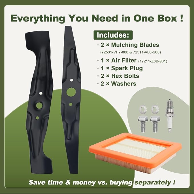 - 1.Complete Maintenance Kit: Includes 2 precision-engineered mulching blades (72531-VH7-000 & 72511-VL0-S00), 1*air filter (17211-Z8B-901), 1 spark plug, 2*M10×25mm hex bolts and 2*10mm washers for full system maintenance