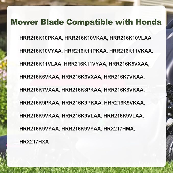 - Compatibility: Mower Blade Compatible with Honda HRR216K10PKAA,HRR216K10VKAA,HRR216K10VLAA,HRR216K10VYAA,HRR216K11PKAA,HRR216K11VKAA,HRR216K11VLAA,HRR216K11VYAA,HRR216K5VXAA,HRR216K6VKAA,HRR216K6VXAA,HRR216K7VKAA,HRR216K7VXAA, HRR216K8PKAA,HRR216K8VKAA,HRR216K9PKAA,HRR216K9PKAA,HRR216K9VKAA,HRR216K9VKAA,HRR216K9VLAA, HRR216K9VLAA,HRR216K9VYAA,HRR216K9VYAA,HRX217HMA,HRX217HXA