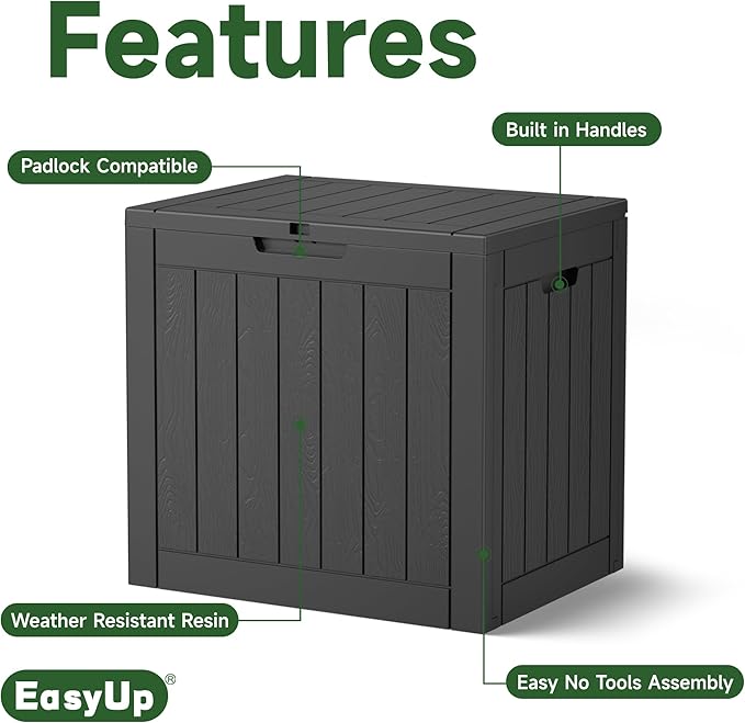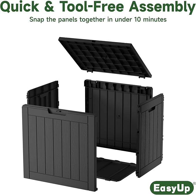 - EASY TO INSTALL: Assembling this outdoor storage box takes less than 10 minutes and requires no tools. Simply snap the panels together, and your storage solution is ready to use, saving you time and effort.