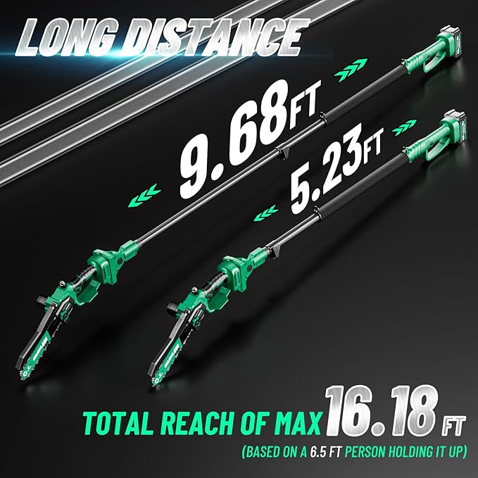 - Adjustable 180°Telescopic Pole: The 180°rotatable head provides excellent cutting flexibility, and the extension pole can be extended from 5.23 to 9.68 feet and up to 16.18 feet (based on a 6.5-foot tall person extending the pole saw to shoulder level). Trimming branches in different locations is easy and effortless without having to rely on unstable ladders.