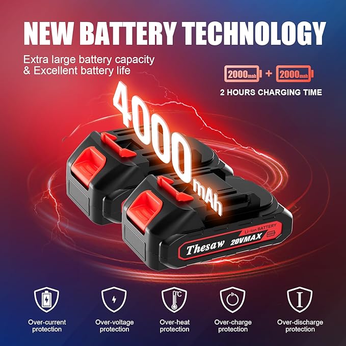 - 【Friendly Service & Package Included】- We are confident in the quality of the product. We offer 24hrs friendly customer service to keep you away from after-sales worry, and you will get 12 months for the motor and battery guarantee. Package include 1X Mini Chainsaw, 2 x Battery, 1 x Suitcase, 3 x Chain, 1 x Guide Plate Protection Case, 1 x Gloves, 1 x Splash Glasses, 1 x Wall Charger, 1 x Screwdriver, 1 X User Manual.