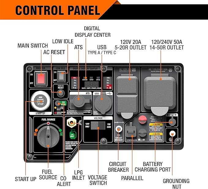 - 【Powerfull Control center】 digital display fertures total running hours , load level,and fuel level and AMPS used, overload,low oil . Type-C charge ports . voltage transfer switch,the 50A socket can get full power under 120V.
