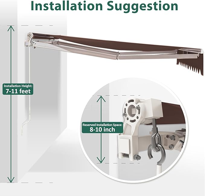 - [Installation Instructions] - Awning, crank handle, bracket, 2 Retractable mounting brackets, instruction manual and additional mounting hardware - open/close by hand crank. Note:Please prepare the following tools before installation(notincluded withthe product):Power drill with drilling bit, Tape, Wrench.