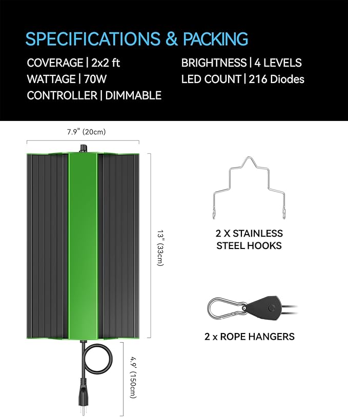 - Energy-Saving LED Technology: The 70W LED grow light features Samsung LM301 diodes, offering high energy efficiency (2.75 μmol/J) and superior light output while consuming less power than traditional HID lamps, making it a cost-effective choice.