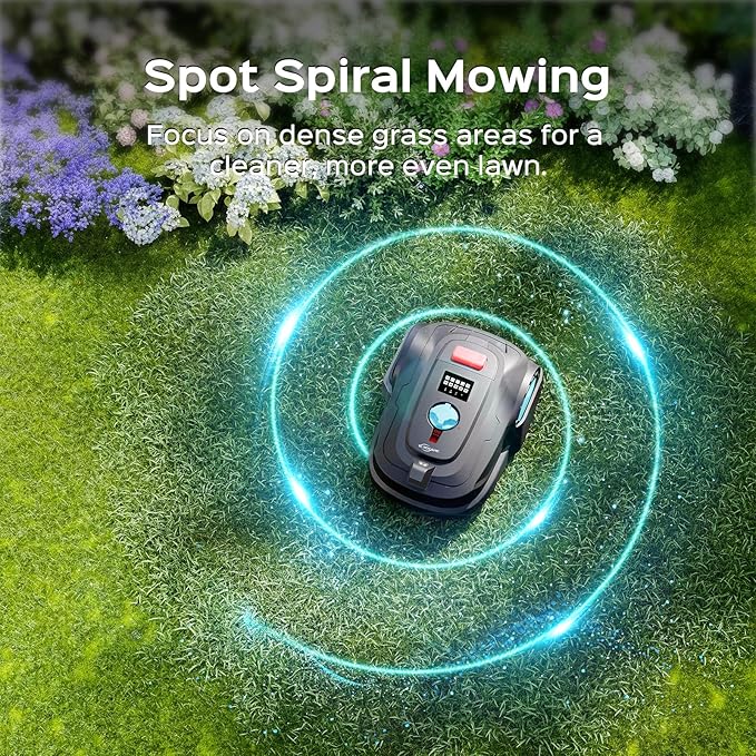- Spot Spiral Mowing: For areas with denser grass growth, the spiral mode ensures even coverage, enhancing mowing efficiency and consistency. This feature helps achieve a cleaner, more uniform look, keeping your lawn neat and visually appealing.