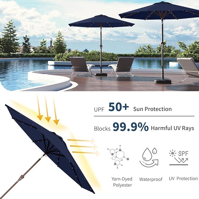10FT Solar Umbrella 32 LED Lighted Patio Umbrella Table Market Umbrella w/Tilt and Crank, UV-Resistant Outdoor Umbrella for Pool, Garden, Deck, Navy Blue