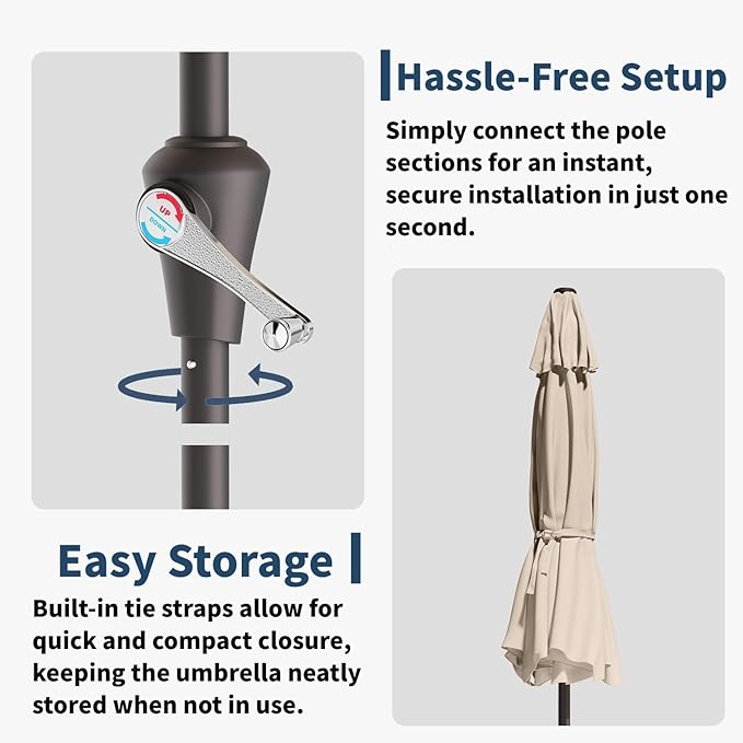 - Convenient Tilt and Crank Mechanism: Easily adjust the umbrella's angle with the push-button tilt feature to block the sun at different times of the day. The user-friendly crank handle allows for smooth opening and closing.