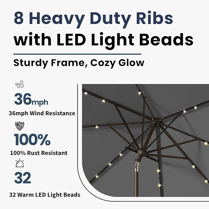 10FT Solar Umbrella 32 LED Lighted Patio Umbrella Table Market Umbrella w/Tilt and Crank, UV-Resistant Outdoor Umbrella for Pool, Garden, Deck, Gray