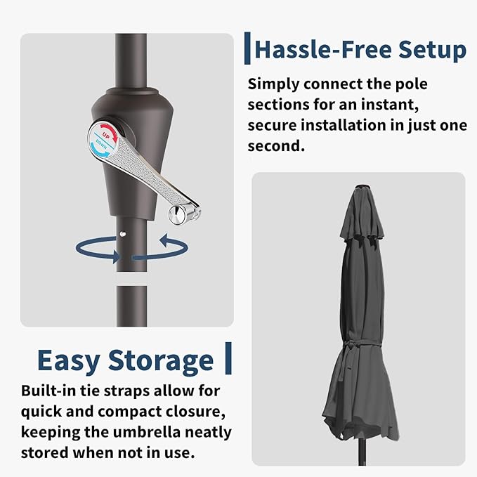 - Convenient Tilt and Crank Mechanism: Easily adjust the umbrella's angle with the push-button tilt feature to block the sun at different times of the day. The user-friendly crank handle allows for smooth opening and closing.