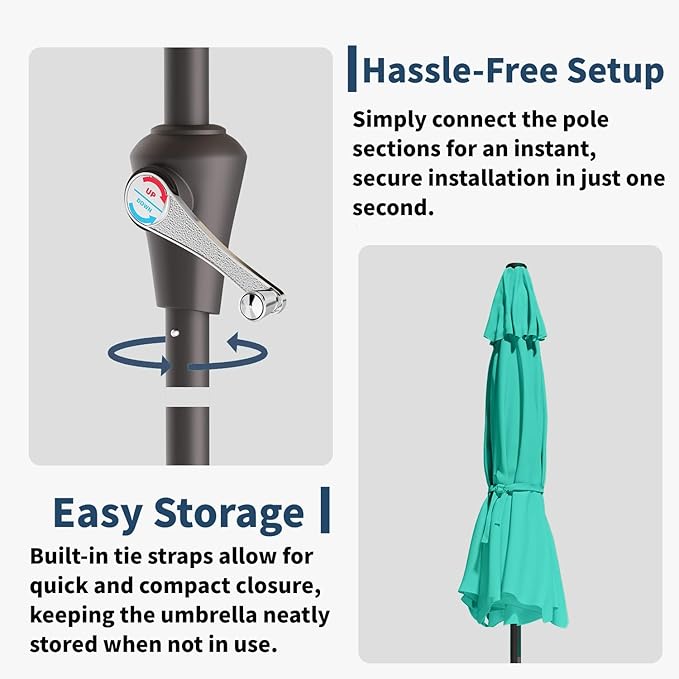 - Convenient Tilt and Crank Mechanism: Easily adjust the umbrella's angle with the push-button tilt feature to block the sun at different times of the day. The user-friendly crank handle allows for smooth opening and closing.