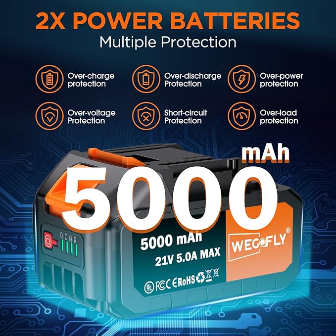 - 🌿【2 x 21V 5.0Ah Batteries】: Equipped with two 21V 5.0Ah high-capacity batteries, suitable for all 21V series of power tools under the WeGofly brand.