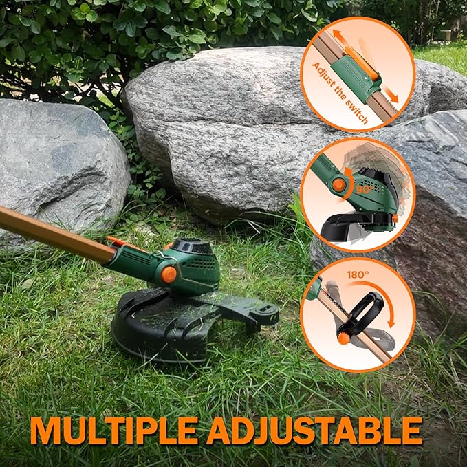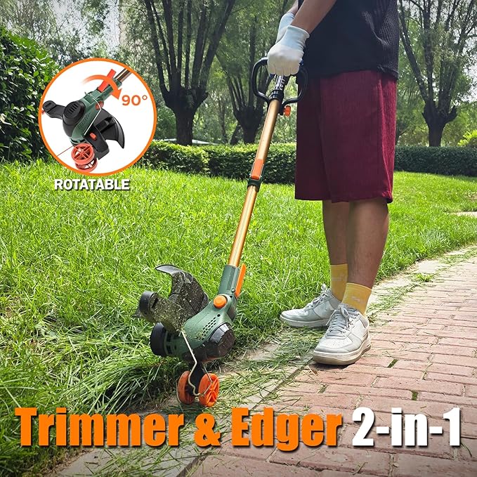 - 🌿【2 IN 1 Trimmer & Edger】: With wheels, you can easily rotate it from Trimmer to Edger by adjusting the button on the head, it can easily clean the lawn.