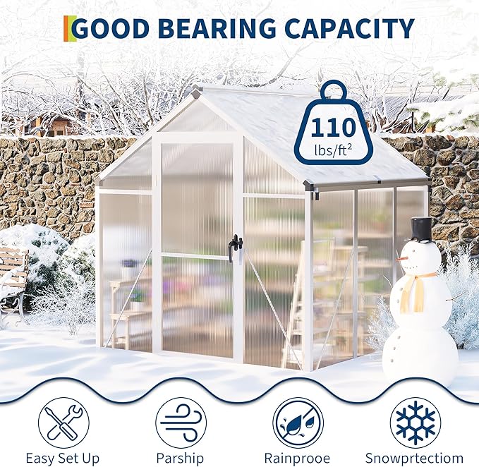 - 【High-Performance PC Panels】Engineered for outstanding performance, our greenhouse incorporates tough 720g/m² polycarbonate panels. These nearly unbreakable panels allow 70% light transmission, creating an ideal environment for plant growth while effectively blocking over 99.9% of UV rays. Perfectly sized for a variety of settings, including backyards, terraces, or gardens, this greenhouse provides ample space for both hobbyist and seasoned gardeners