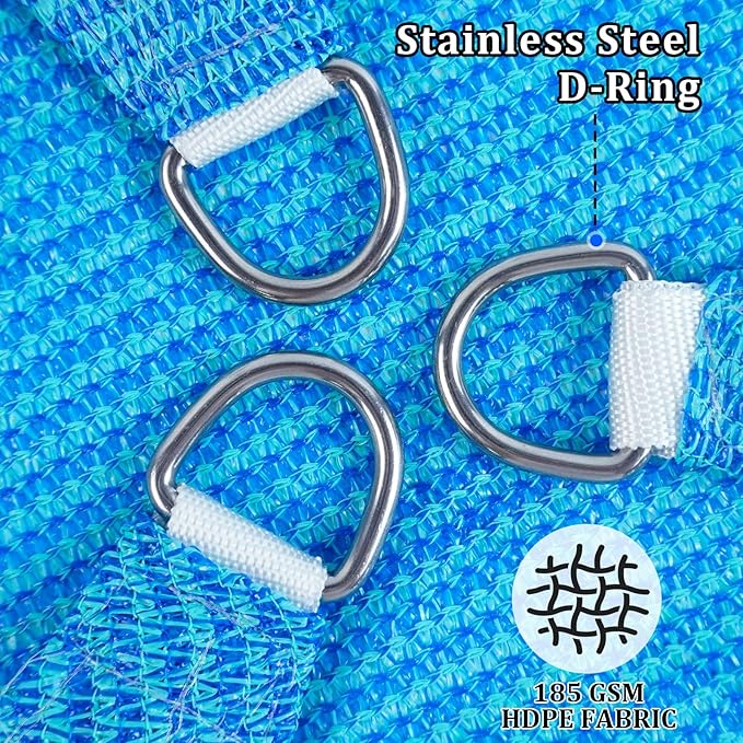 - High-Quality Fabric: Made from 185 GSM UV-protected high-density polyethylene (HDPE) shade fabric with strong stitched seams and durable stainless steel D-rings in each corner; the curved edges enhance stability