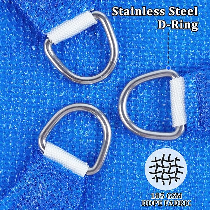 - High-Quality Fabric: Made from 185 GSM UV-protected high-density polyethylene (HDPE) shade fabric with strong stitched seams and durable stainless steel D-rings in each corner; the curved edges enhance stability