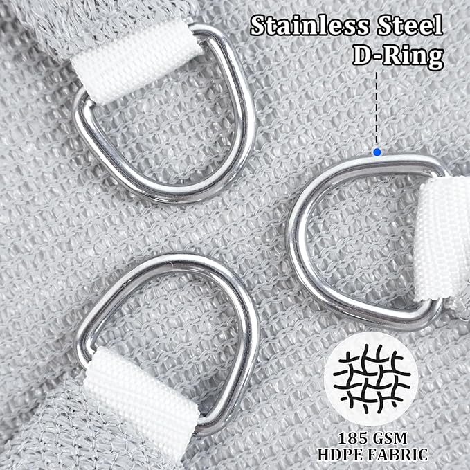 - High-Quality Fabric: Made from 185 GSM UV-protected high-density polyethylene (HDPE) shade fabric with strong stitched seams and durable stainless steel D-rings in each corner; the curved edges enhance stability