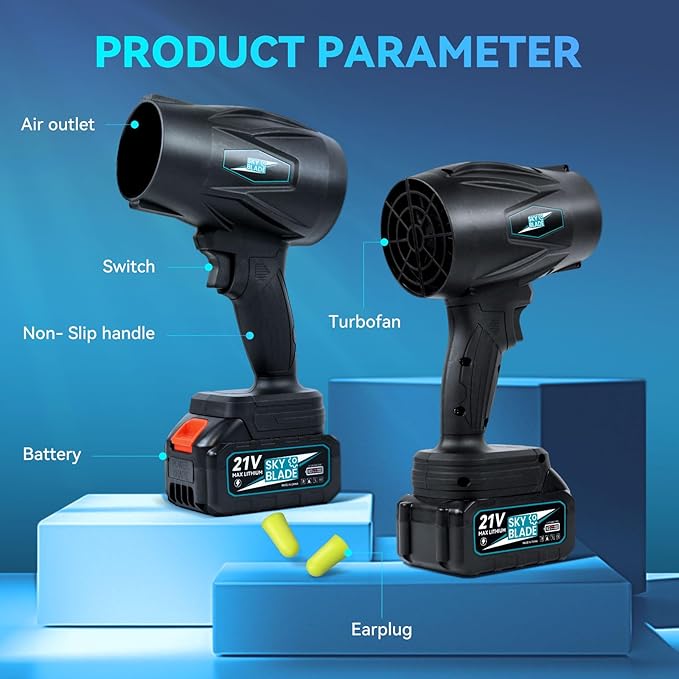 - Included Components : A SkyBlade Leaf-blowers, A pair of earplugs, One Adapter, Two Batteries