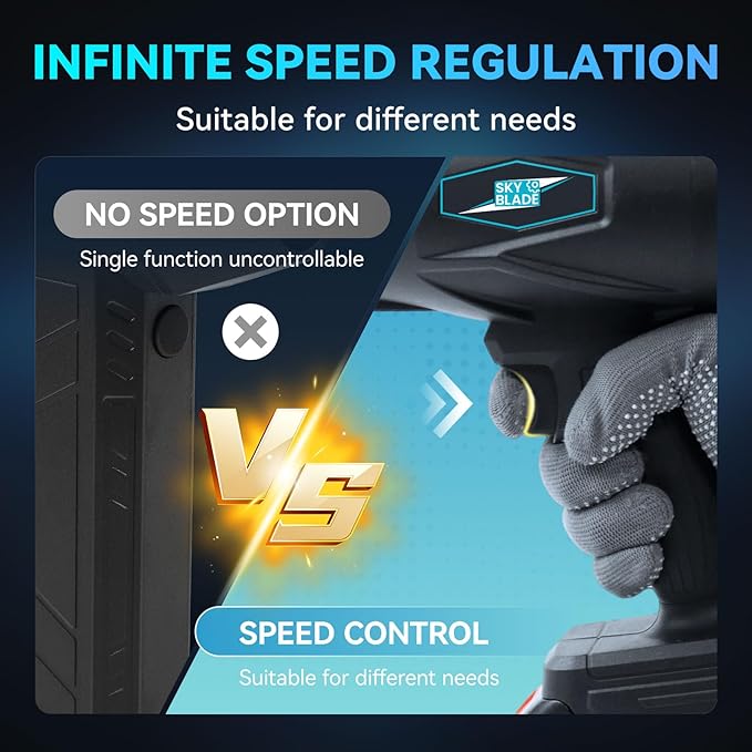 - 【Adjustable Speed】Our cordless leaf blower can infinitely adjustable speed.When we press the switch, the wind will become stronger as the pressure increases, and the wind will decrease as the pressure decreases. We can easily control the wind speed and meet different usage needs.