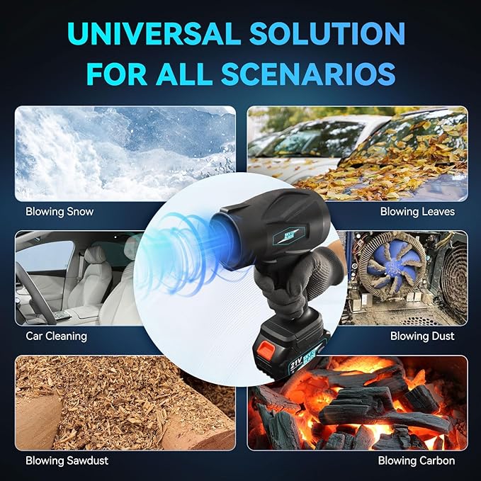 - 【Lightweight and portable】The leaf blower features a compact 8 x 6 x 3-inch body with a lightweight, easy-to-hold shape. The innovative cordless construction dramatically improves operational flexibility, eliminating the need to tangle traditional cords or limit their length, and the lightweight design makes it a zero-burden carry-all, so it's easy to stow and go, whether you're outdoors camping or traveling.