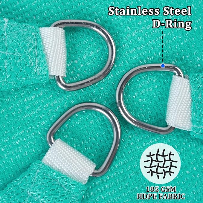 - High-Quality Fabric: Made from 185 GSM UV-protected high-density polyethylene (HDPE) shade fabric with strong stitched seams and durable stainless steel D-rings in each corner; the curved edges enhance stability