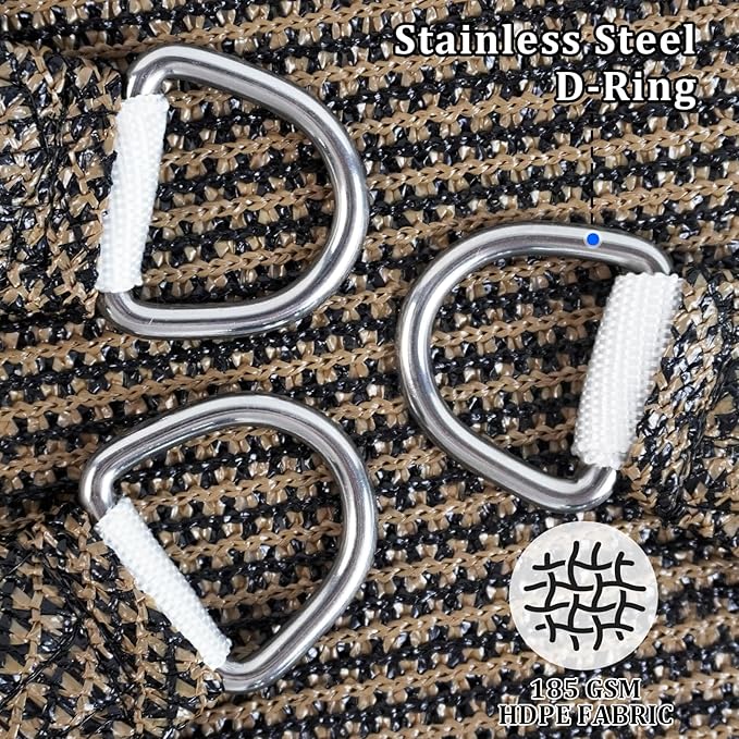 - High-Quality Fabric: Made from 185 GSM UV-protected high-density polyethylene (HDPE) shade fabric with strong stitched seams and durable stainless steel D-rings in each corner; the curved edges enhance stability