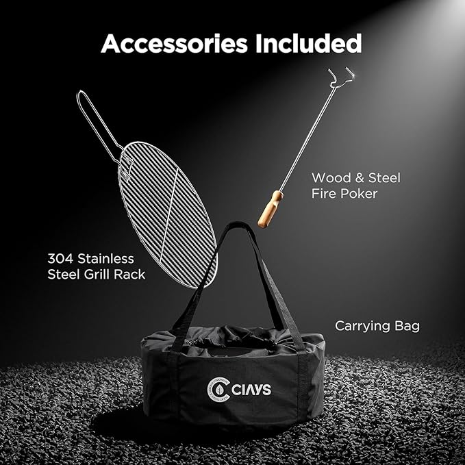 Ciays Smokeless Firepit for Outside, 21 Inch Outdoor Fire Pit for Camping with Patented Technology, Portable Fire Pit with Steel Grill Rack, Fire Poker, and Bag, Easy Setup and Storage, Wood Burning