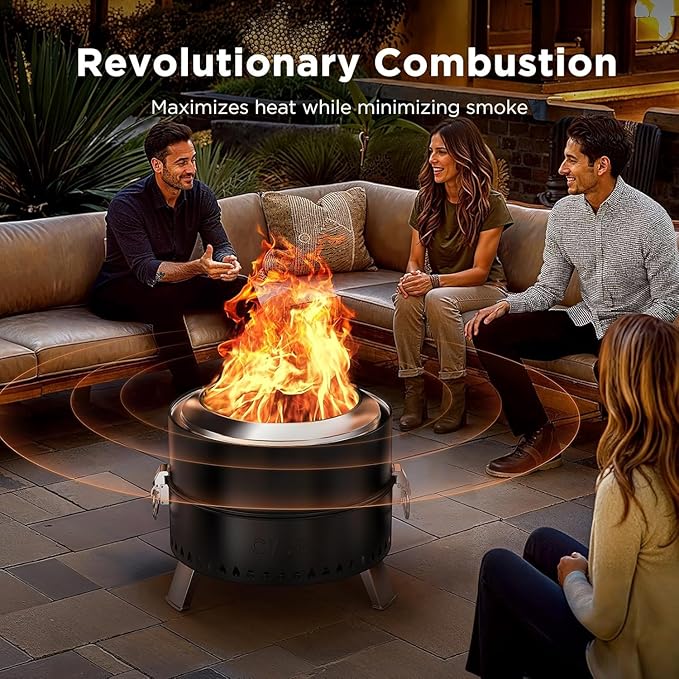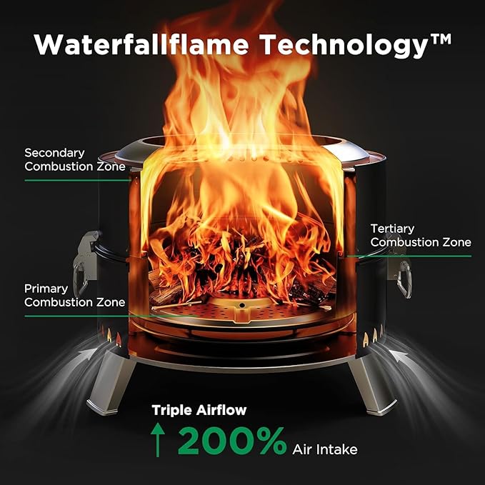 - Waterfallflame Technology (TM): Our patented Waterfallflame Technology (TM) is designed with triple-layer combustion that maximizes heat output while minimizing smoke. The revolutionary design boosts airflow by 200% while evenly distributing it with 360° Airflow Heat, ensuring a hotter, cleaner burn. Enjoy a superior wood-burning fire pit for outside with less smoke for comfortable gatherings without smoke irritation.