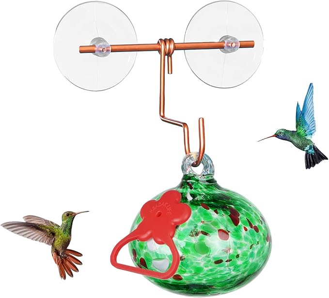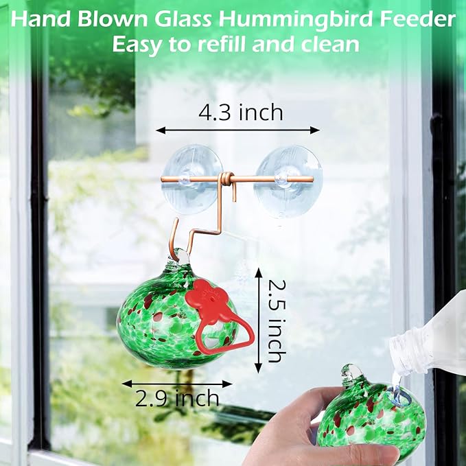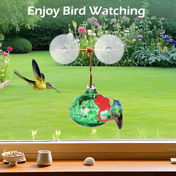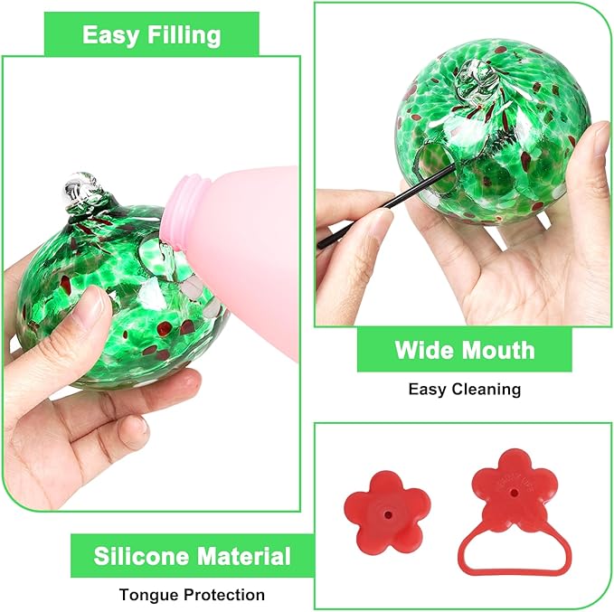 - Handcrafted Glass Art:Each small hummingbird feeder ball is expertly crafted by skilled artisans,never fade or leak,easy to clean and refill;featuring eye-catching red silicone flowers that not only attract hummingbirds quickly but also protect their tongues from injury;Decorative hummingbird feeders for outdoors,garden,yard