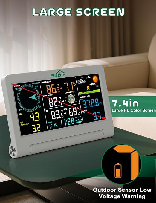 - ➽【Multi-function Display Screen】The 7.4-inch HD large color screen can display 12 types of information at the same time, including Wind Speed and Direction, Rainfall, Weather Forecast, Air Pressure, Time, Moon Phase, Indoor and Outdoor Temperature and Humidity, Feelslike Temperature, Dew Point Temperature and other information, and has 13 alarm settings to choose from. The console can be hung on the wall or placed on the desktop, with clear reading, simple and beautiful.