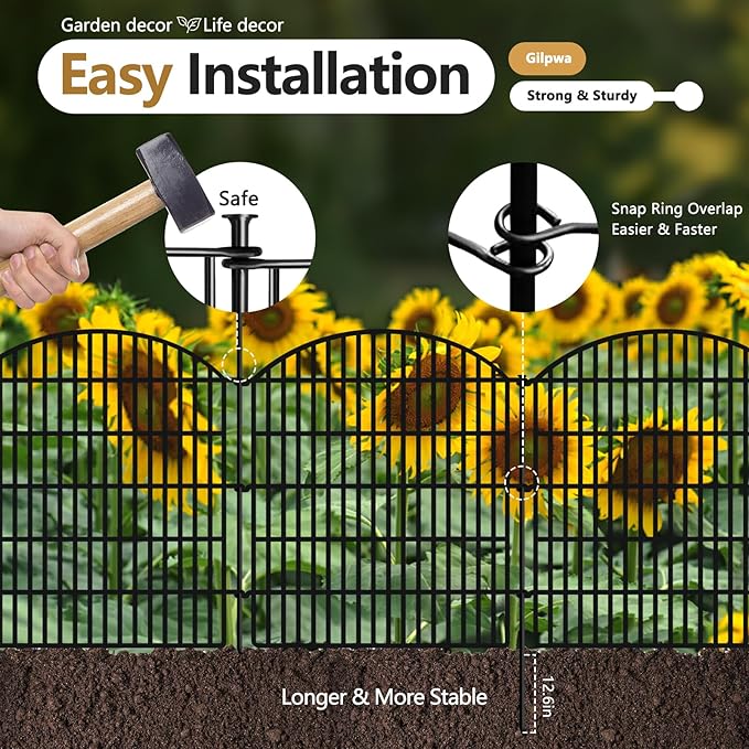 - EASY TO MAINTAIN: Decorative fence has no assembly requires, simply insert the metal stakes through two connecting circular hole into the ground. It's convenient for you to set up your garden view at less time and enjoy your garden at more time. Any questions, please let us know via email, we will respond to you within 24 hours to provide you with a solution!