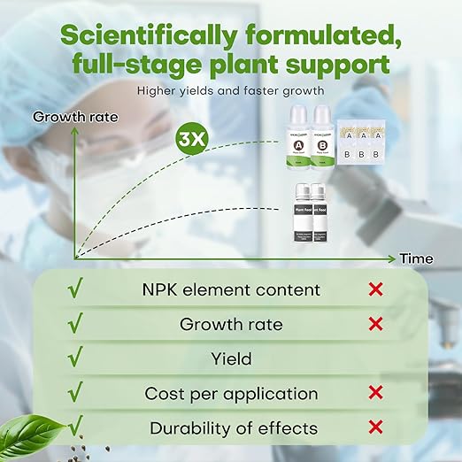 - Complete All-in-One Plant Food: Give your plants the perfect balance they crave. Our 800ml A&B hydroponic nutrients solution is a complete hydroponic plant food formula, meticulously crafted to provide everything your vegetables, fruits, and flowers need for the entire growth cycle—from vigorous vegetative growth to prolific flowering and fruiting. Eliminate the guesswork of mixing multiple bottles.
