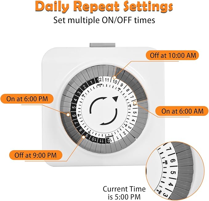 - 【Simple & User-Friendly Setup】Easily set the current time using the mechanical dial and push pins up or down to create ON/OFF cycles. Once programmed, the timer repeats daily, automating lights and appliances without any hassle