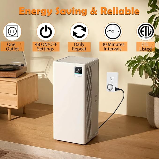 - 【24-Hour Automate Your Home】This outlet timer allows precise automation with 30-minute intervals and 48 ON/OFF settings. Effortlessly schedule your devices to turn on and off exactly when you want, saving time and energy