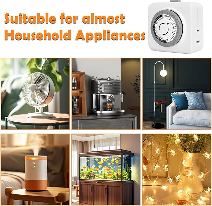 - 【2Pack 2-Prong Outlets】Control your devices with this timer outlets. Rated at 1875W, this timer socket is compatible with various devices such as lamps, fans, plant lights, and holiday decorations, making it perfect for daily use and countdowns