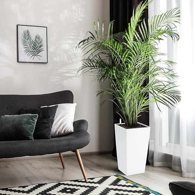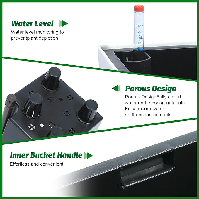 - Automic Watering System: Each tall black planters comes with built-in drainage holes and a sink to ensure that your greenery absorbs water smoothly and minimizes root rot. When the water level is low, the automatic watering system kicks in to provide your plants with the necessary moisture with minimal effort